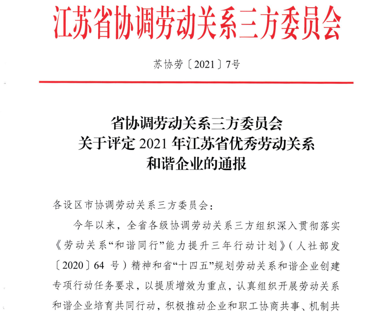 按照《關(guān)于開展2021年勞動(dòng)關(guān)系和諧企業(yè)培育和評(píng)定的通知》(蘇協(xié)勞〔2021〕4號(hào))的工作部署,省協(xié)調(diào)勞動(dòng)關(guān)系三方委員會(huì)研究決定,評(píng)定江蘇揚(yáng)子凈化工程有限公司等200家企業(yè)為“2021年江蘇省優(yōu)秀勞動(dòng)關(guān)系和諧企業(yè)”。
