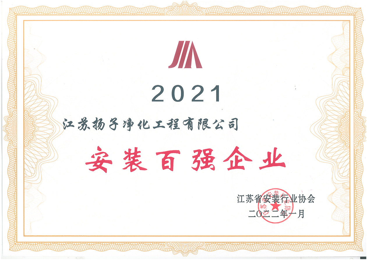 近日,江蘇省安裝行業(yè)協(xié)會(huì)下發(fā)了2021年度“安裝百強(qiáng)企業(yè)”榮譽(yù)證書。此前根據(jù)協(xié)會(huì)公布的2021年度“安裝百強(qiáng)企業(yè)”評(píng)價(jià)標(biāo)準(zhǔn),江蘇揚(yáng)子凈化工程有限公司順利通過審核,榮獲此項(xiàng)稱號(hào)。