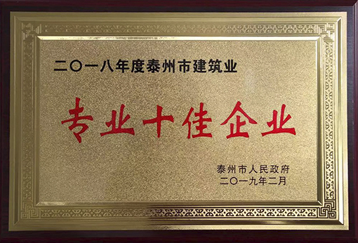根據泰州市人民政府辦公室《關于表彰2018年度泰州市建筑業十強企業明星企業專業十佳企業的決定》,江蘇揚子凈化工程有限公司榮膺2018年度泰州市建筑業“專業十佳企業”稱號。