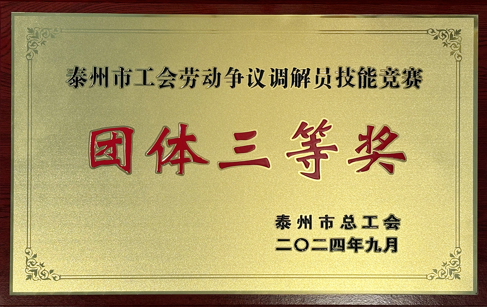泰州市工會(huì)勞動(dòng)爭(zhēng)議調(diào)解員技能競(jìng)賽于9月19日在泰州舉辦。我司江蘇揚(yáng)子凈化工程有限公司調(diào)解委員會(huì)調(diào)解員積極參賽、備賽,所在的泰興代表隊(duì)表現(xiàn)出色,榮獲“團(tuán)體三等獎(jiǎng)”。